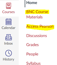 • All homework must be completed through the”BNC Course Materials’ or ‘Access Pearson’ tab found on the left navigation panel in Canvas course page shown below.