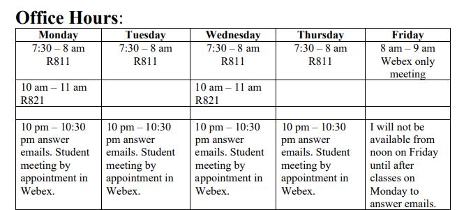 Each week instructors have time set aside to meet with students outside of class. (Traditionally these times are called “office hours”.) This is a time when a student may ask questions regarding the class, or discuss a particular problem/topic with an instructor one-on-one. Student hours may be held in-person or online. See below for instructions on where/when/how instructors will offer student hours in this class.