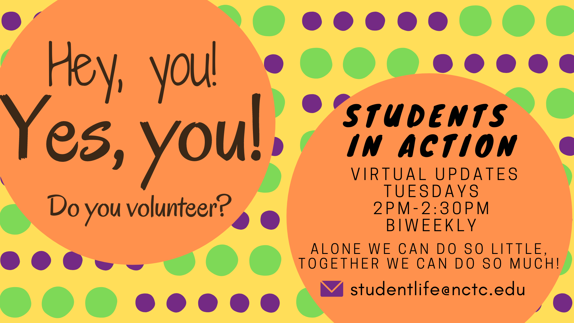 After identifying an area for improvement on campus, SGA brainstorms possible solutions, and communicates with the appropriate offices on campus to make a more successful NCTC experience wherever possible. Students may share their perspectives, ideas, and concerns by emailing sga@nctc.edu or attending SGA meetings. Students can visit the Student Life/SGA Canvas group for information about meeting dates, times, and locations.